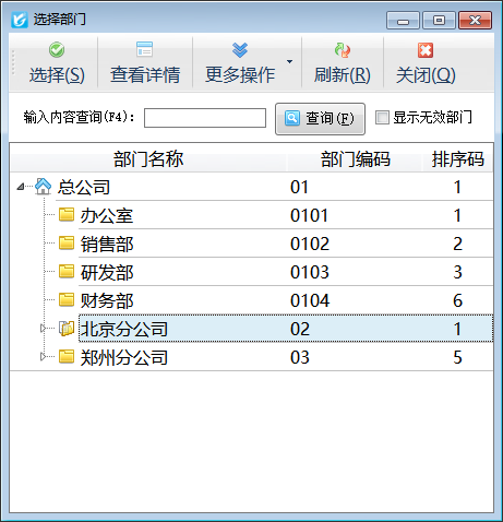 所屬部門:非必填項,選擇員工后,系統自動會填寫入該員工的部門。如需要修改,請點擊“選擇部門”按鈕,系統彈出“選擇部門”窗口,如下圖所示: