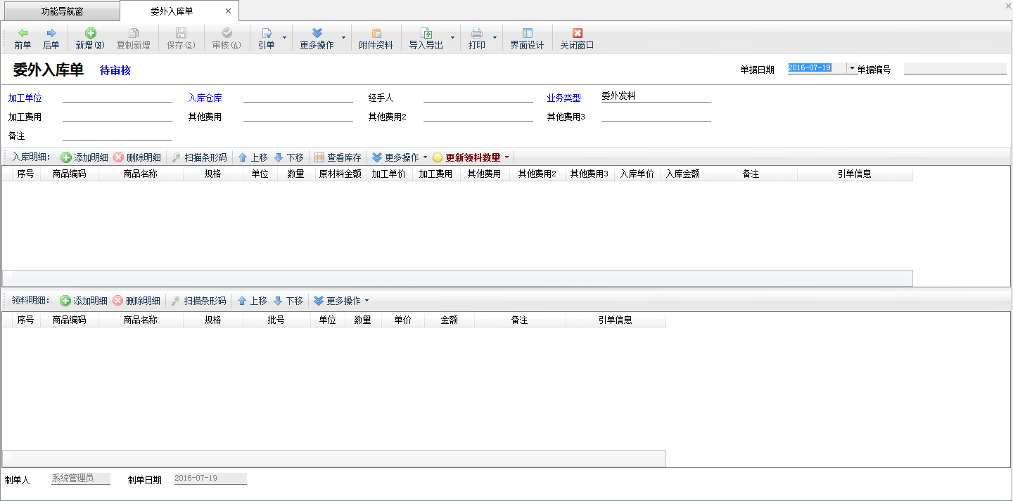????在功能導航窗,點“生產管理”—》“委外加工”—》“委外入庫單”,即可進入委外入庫單界面,如下圖所示: