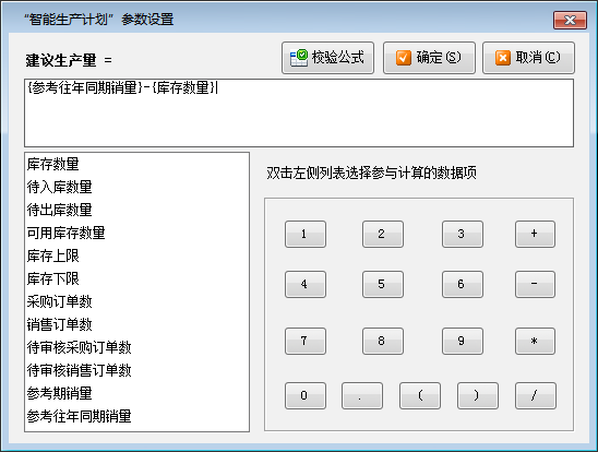 (1)參數設置:可以設置“建議生產量”的運算公式,軟件將根據您設計的公式計算出建議數量。
