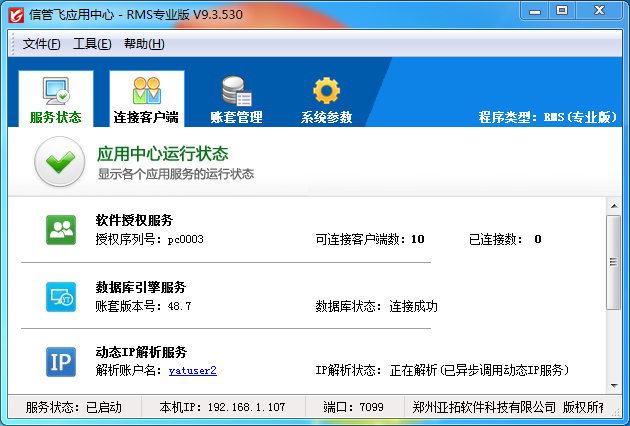 ????應(yīng)用中心可以全面掌控軟件的運(yùn)行情況,可以隨時(shí)查看各類(lèi)服務(wù)的運(yùn)行狀態(tài),主要包括軟件授權(quán)服務(wù)情況、數(shù)據(jù)庫(kù)引擎服務(wù)情況、動(dòng)態(tài)IP解析服務(wù)情況、手機(jī)短信服務(wù)情況等。