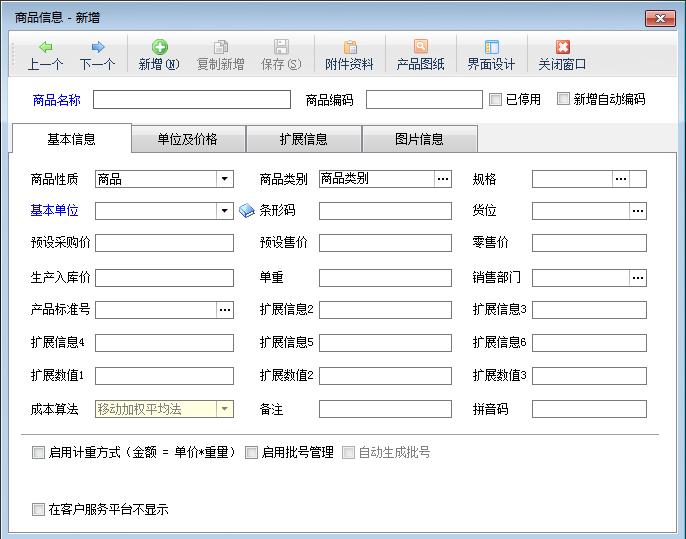 基本單位:默認計量單位,每個商品必須有一個默認的計量單位。商品性質為“服務及費用”的商品,其基本單位可設置為“套”。