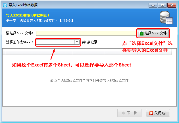 ????①方式一:點“導入導出”—》“從Excel導入明細”,彈出“導入Excel數據”窗口,導入方式“直接選擇Excel文件”,如下圖所示: