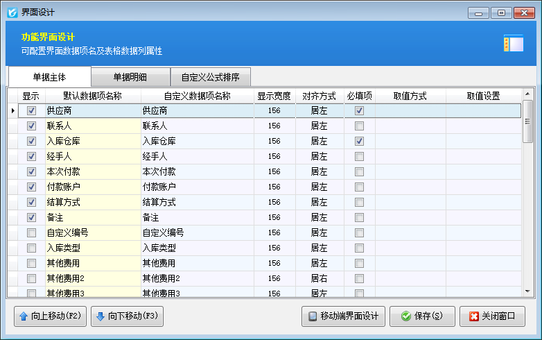 界面設計:點“界面設計”按鈕可以對單據界面上的數據項進行自定義,實現企業的個性化需求。