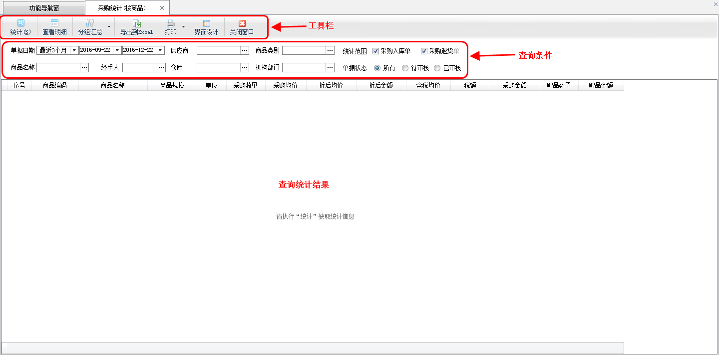 ????在功能導航中點“采購管理”—》“采購入庫單”,進入采購入庫單錄入界面,單據界面分為“工具欄”、“單據主體”、“單據明細”三部分。
