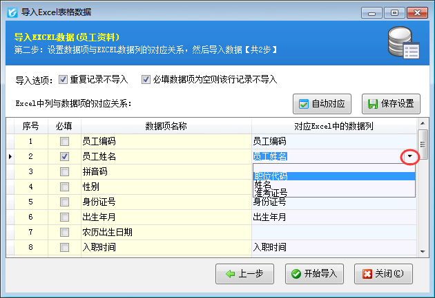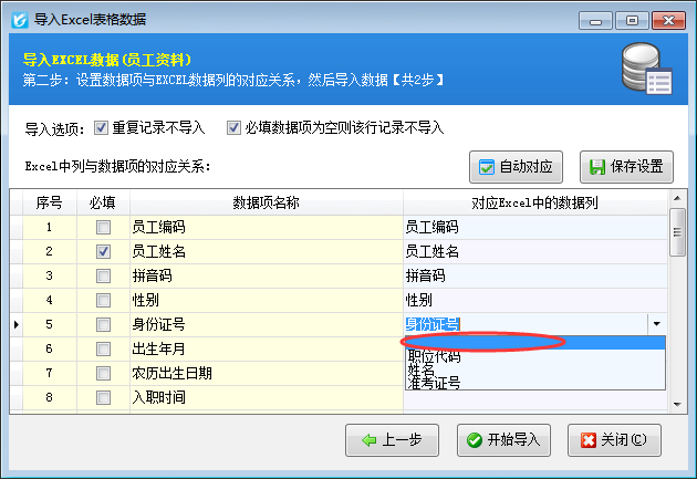 配置數(shù)據(jù)項與Excel中數(shù)據(jù)列的對應(yīng)關(guān)系:點“下一步”按鈕配置“數(shù)據(jù)項”與Excel中的數(shù)據(jù)列之間的對應(yīng)關(guān)系。點“自動對應(yīng)”軟件會自動根據(jù)數(shù)據(jù)項名稱和數(shù)據(jù)列列名是否相同進行自動匹配。也可以按照下圖所示手工選擇對應(yīng)關(guān)系。