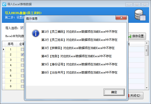 ????如果點“開始導(dǎo)入”按鈕,軟件提示對應(yīng)的數(shù)據(jù)列在Excel中不存在的錯誤提示,如下圖所示: