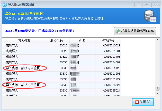 ????導(dǎo)入過程中軟件會實時顯示導(dǎo)入進度,如果數(shù)據(jù)量比較大時,導(dǎo)入進度達到100%時軟件進行數(shù)據(jù)提交會比較耗時。導(dǎo)入結(jié)束后,軟件會顯示導(dǎo)入的結(jié)果。沒有導(dǎo)入的記錄軟件會給出相應(yīng)的原因,如下圖所示: