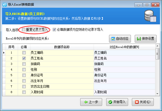 導(dǎo)入失敗,數(shù)據(jù)內(nèi)容重復(fù):這種情況是因為軟件根據(jù)條件判斷相應(yīng)的記錄在數(shù)據(jù)庫中已存在(一般根據(jù)名稱,如商品名稱、姓名、客戶名稱、供應(yīng)商名稱等),如果確實需要導(dǎo)入,可以取消下圖中的選項,重新導(dǎo)入: