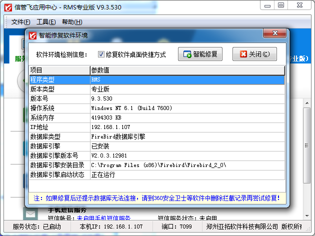 ????在應(yīng)用中心點(diǎn)擊菜單“工具”—》“智能修復(fù)軟件環(huán)境”,然后點(diǎn)“智能修復(fù)”按鈕,軟件會(huì)自動(dòng)重建數(shù)據(jù)庫環(huán)境,并創(chuàng)建桌面快捷方式。