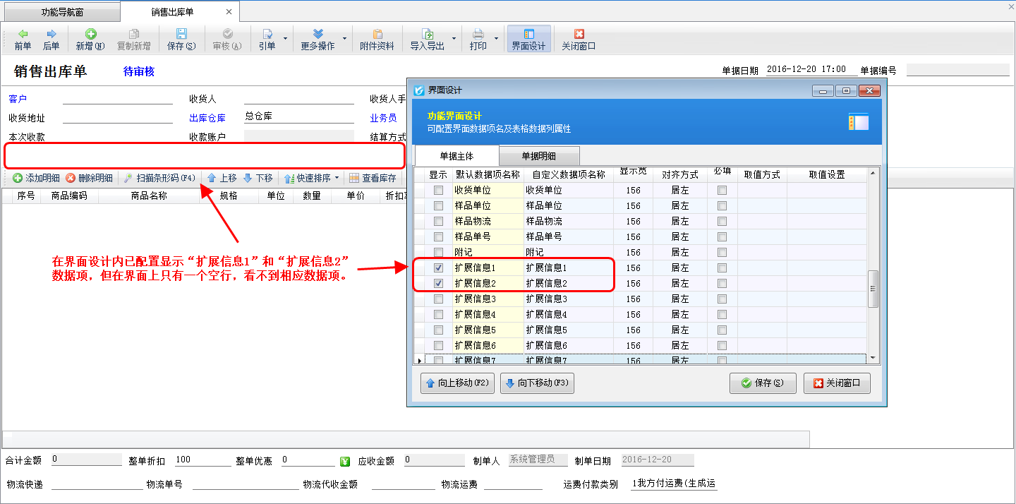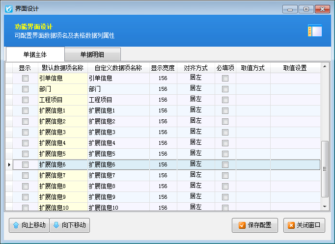 ????“單據(jù)主體”中如果打勾設(shè)置顯示數(shù)據(jù)項(xiàng),但在界面上看不到,這是因?yàn)檫@個(gè)數(shù)據(jù)項(xiàng)目上方還有多個(gè)不顯示的數(shù)據(jù)項(xiàng),遇到這種情況將相應(yīng)的數(shù)據(jù)項(xiàng)向上移動,與其他需要顯示的數(shù)據(jù)項(xiàng)移動到一起,然后“保存配置”按鈕即可。如下圖所示,可以將“擴(kuò)展信息 1”和“擴(kuò)展信息 2”移動到上面即可: