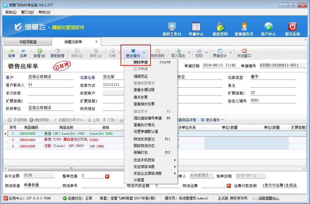 ????業務單據已審核后默認是不允許刪除的,如果需要刪除,需要先紅沖此單據,然后再刪除,即可刪除成功,在單據界面工具欄點擊“更多操作”—》“紅沖單據”即可紅沖單據,如下圖所示: