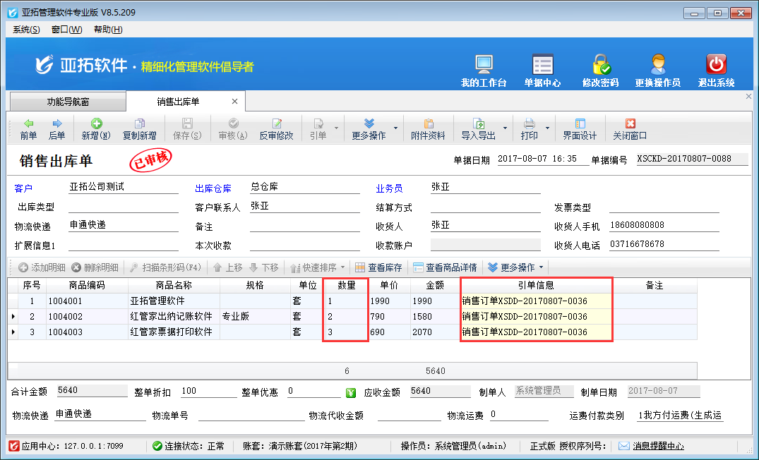 ????亞拓管理軟件星光版、標準版、專業版都支持在開采購訂單時直接引用銷售訂單明細數據,以專業版軟件為例,開采購訂單時如何直接引用銷售訂單明細數據?首先我們先開一個銷售訂單,保存并審核,如下圖所示: