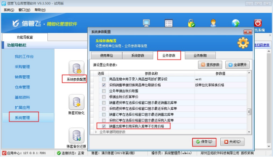 ????在功能導航窗點擊“系統管理”—》“系統參數配置”—》“業務參數”,進入“業務參數”配置界面,在庫存管理參數中找到并勾選參數“允許0成本出入庫”,之后點擊“保存”,如下圖所示: