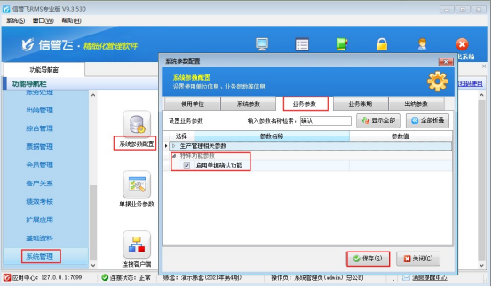 ????在功能導航窗點擊“系統管理”—》“系統參數配置”,進入系統參數配置界面,點擊“業務參數”,勾選“銷售(采購)退貨單可引用訂單”參數,點擊保存按鈕,如下圖所示: