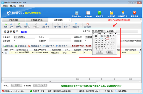 ????信管飛RMS專業版軟件在補錄之前日期單據保存時,提示以下消息“單據日期【2022-08-31】不能小于本期開始日期【2022-09-01】”,如下圖所示,出現此提示該如何解決?本文進行示范操作。