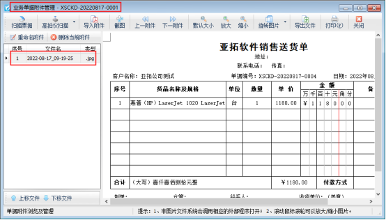 ????亞拓管理軟件標準版和專業版在新增或者修改業務單據時,支持添加文檔、圖表等附件資料,可掃描或導入與業務單據相關的電子文件,方便用戶更全面、直接地查詢業務單據的全過程,有利于企業對業務單據的管理。下面我們以亞拓管理軟件專業版銷售出庫單為例介紹一下附件資料管理功能的使用。