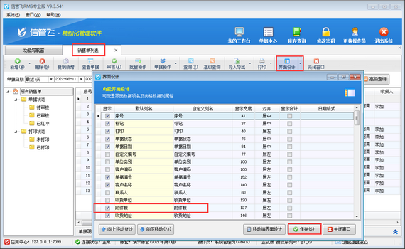 ????以銷售單列表為例,配置下如何查看銷售單附件數,在銷售單列表工具欄點擊“界面設計”打開界面設計窗口,找到“附件數”數據項,并勾選顯示出來,如下圖所示。
