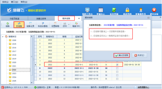 ????出現此提示,是因為軟件已把8月份賬已結賬導致,結賬后賬期內單據無法修改和新增,需要補錄8月份的單據,需要先進行“反結賬”操作,在功能導航窗點擊“財務處理”—“期末結賬”。在期末結賬界面可看到當前結賬日期到2022-8-31,點擊工具欄“反結賬”按鈕,彈出提示消息,點擊“確認反結賬”,賬期往后倒一個月,結賬時間到2022-7-31,如下圖所示: