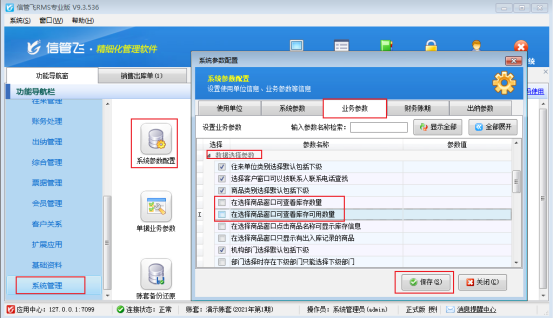 ????如何設置輸入商品時自動檢索,操作步驟如下,在功能導航窗點擊“系統管理”—“系統參數配置”,在“業務參數”的選擇參數中取消勾選參數“在選擇窗口可查看庫存數量”和“在選擇窗口可查看庫存可用數量”,然后保存設置,如下圖所示: