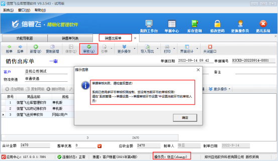 ????“一審”操作員“張亞”登錄軟件,新開銷售出庫單,保存并審核單據,審核狀態顯示“一審”,操作員“張亞”沒有二審權限,再次點擊“審核”會提示“系統已啟用多環節審核權限控制,您沒有當前環節的審核權限!”如下圖所示: