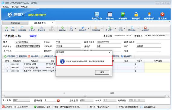 ????設置完成之后,使用操作員賬號“張亞”登錄軟件,打開一個銷售出庫單,然后點擊“更多操作”→“發送微信消息”→“發送微信模板消息”進行發送微信消息通知時,系統會彈出提示信息“您沒有發送微信消息的權限,請于系統管理員聯系!”,如下圖所示。