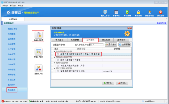 ????在功能導航窗點擊“系統管理”—》“系統參數設置”—》“業務參數”,然后在業務單據相關參數中取消勾選“銷售訂單的自定義編號不允許輸入(取單據編號)”參數,之后點擊保存按鈕,如下圖所示: