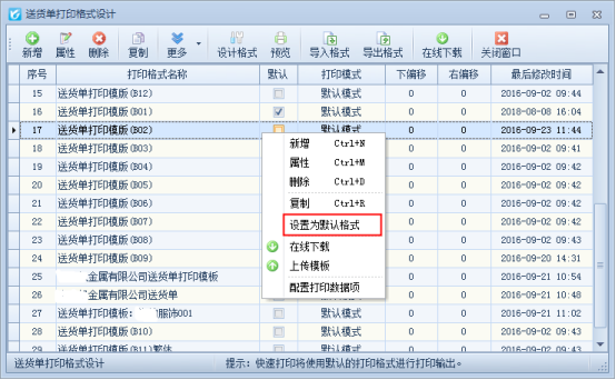 ????一、在打印格式設計界面工具欄的“屬性”中進行操作。如示例需要設置“送貨單打印模板(B02)”為默認模板,選擇B02模板,點擊工具欄中的“屬性”,彈出的打印格式屬性界面,在“默認打印格式”處打勾,然后保存屬性。如下圖所示: