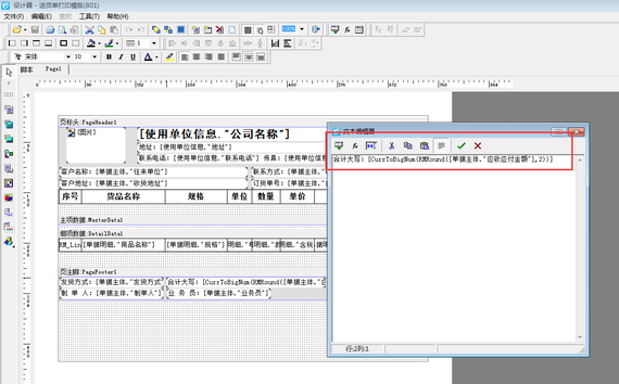 ????打開“設計格式”,在設計器界面,雙擊打開固定的單位名稱文本框,直接在文本編輯器中進行修改單位名稱,修改好后點擊“√”確定,然后保存模板。則固定單位名稱的打印模板修改完成。如下圖所示: