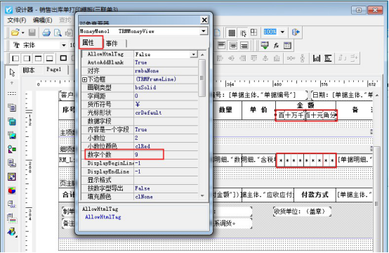 ????打開送貨單開單界面,點擊工具欄“打印”按鈕下的“打印格式設計”,進入打印格式設計界面,選擇打印模板后點擊“設計格式”進入模板設計器界面。在模板設計器界面。選擇金額文本框,鼠標右鍵選擇“屬性”,彈出屬性界面上找到數字個數修改為9(對應的單據明細中的金額也用相同的方式修改下數字個數為9),保存后金額會顯示到百萬,如下圖所示: