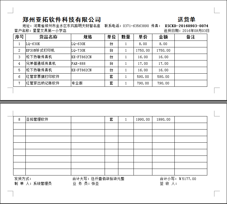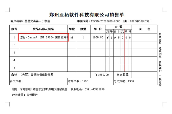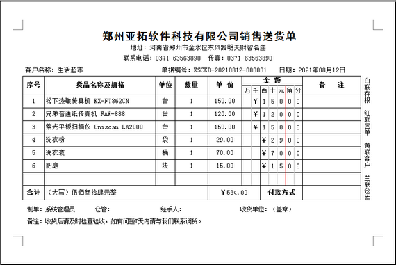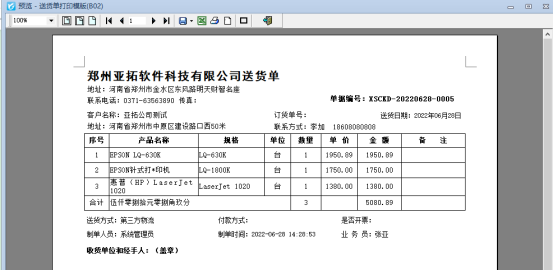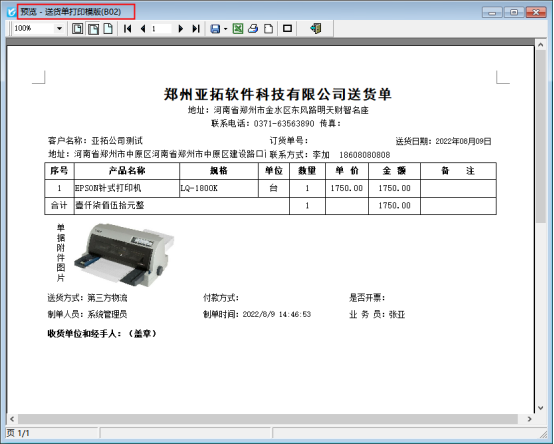 ????軟件默認打印格式的單位是調用的系統管理-使用單位信息,系統管理-系統參數中添加好單位信息后,模板會自動調用顯示,示例單位名稱為:鄭州亞拓軟件科技有限公司,模板預覽圖如下圖所示: