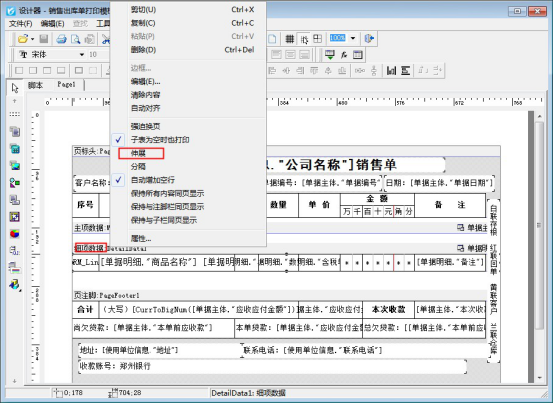 ????設置不顯示空白行,為了避免修改錯誤,可以在打印格式設計界面,選擇模板點擊工具欄中的“復制”按鈕,會自動復制一份打印模板,選擇復制打印模板,點擊“設計格式”進入打印模板設計器界面,在“細項數據”欄上(如沒有細項數據則選擇主項數據),點擊右鍵把“自動增加空行”的勾選符號去掉,然后保存打印模板即可。如下圖所示: