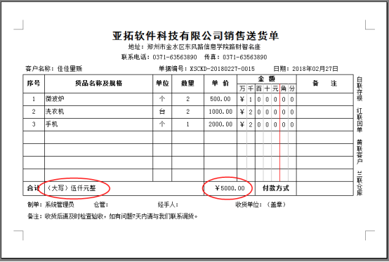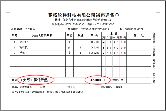 ????信管飛送貨單軟件、信管飛倉庫管理軟件、信管飛RMS都支持開單打印單據,支持打印大寫金額,軟件內置有十幾種打印格式模板,同時支持自定義打印格式模板,本篇文章我們以送貨單軟件為例詳細介紹一下打印模板中如何設置打印大寫金額?