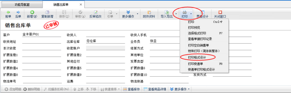 ????在開單界面點擊“打印”—》“打印格式設計”—》選擇打印模板點擊“設計格式”進入設計格式界面,有以下兩種情況: