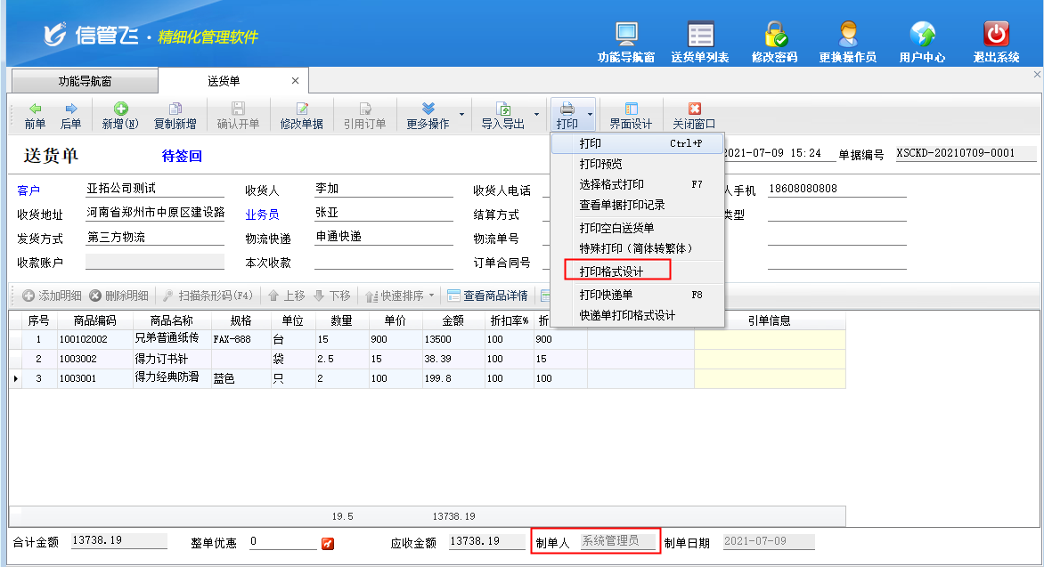 ????亞拓軟件旗下的信管飛送貨單軟件、信管飛RMS軟件、信管飛倉庫管理軟件,都支持開單打印單據,軟件中內置了十幾種打印模板供客戶選擇使用,也支持自定義設計打印模板,軟件內置打印模板設置自動增加空行,根據客戶需要模板不顯示空白行,我們以送貨單軟件為例設置下打印模板不顯示空白行。