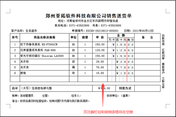 ????信管飛RMS軟件、信管飛送貨單軟件等都支持打印單據,打印模板支持自定義設計格式,存在多聯單支持備注多聯內容,單據開單商品過多會默認根據紙張尺寸打印多頁,有存在多聯備注在打印第二頁的時候不顯示的情況,如下圖所示: