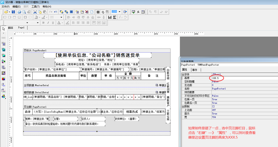 ????在開單界面,打印按鈕下點擊“打印格式設計”,在打印格式設計界面,點擊“設計格式”,可進入模板設計器界面,首先按住ctrl鍵,鼠標選中細項數據的所有文本框,右鍵點擊屬性,在屬性中找到高度,可以修改文本框的高度值;設置完成后,點擊細項數據處,右鍵點擊屬性,修改明細欄高度與之前文本框的高度一致,如下圖所示: