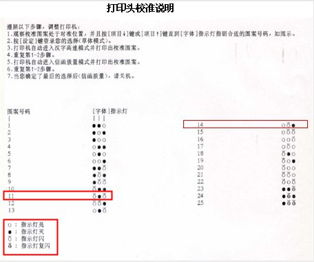 ????從“草體模式下的校準圖樣”中,根據打印效果找到豎線最直的圖型。例如:可看出NO.14打印效果較好;使用【項目↓】鍵把字體指示燈調整成“打印頭校準說明”所示的狀態。例如:按NO.14圖樣進行校準,使用【項目↓】鍵把字體指示燈調整“亮閃滅”狀態。