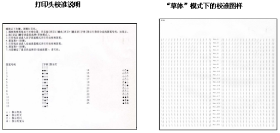 ????確保打印機已經關閉(當使用連續紙時,請確保已裝入打印紙并且打印機已關閉)。按住【暫停】鍵的同時,打開打印機電源,打印機的缺紙燈和暫停燈亮。放入打印紙,打印出打印頭校準說明和草體模式下的校準圖樣,表示已進入“草體”校準模式,如下圖:
