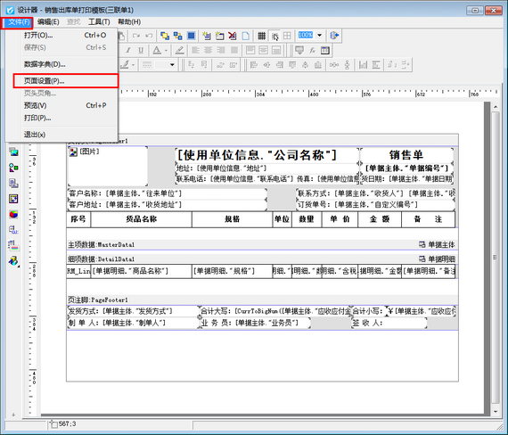 ????在打印格式設計界面,選擇打印格式模板點擊“設計格式”,進入打印格式設計器界面。在模板設計器中點擊左上角“文件”,彈出的界面上點擊“頁面設置”,進入頁面設置界面,如下圖所示: