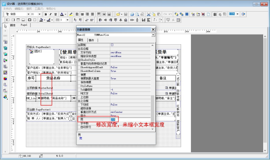 ????如何在打印模板上加上此列?打印模板格式因為尺寸固定,需要增加新的明細列,要先縮小其他文本框的寬度。在開單界面打印下選擇打印格式設計,打印格式設計界面點擊“設計格式”,進入模板設計器界面,選擇需要縮短寬度的文本框,鼠標左鍵單擊選擇文本框(需要多選可按著shift鍵鼠標分別單擊,可同時修改兩個文本框),下一步鼠標右鍵,選擇屬性,打開“對象查看器”找到寬度,修改寬度,enter鍵確認,然后關閉“對象查看器”可看到文本框按寬度修改,如下圖所示: