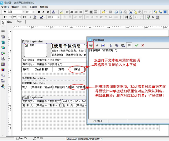 ????文本框添加完成后,雙擊打開文本框進行添加數據,表頭文本框打開輸入文字“顏色”,明細項文本框調用數據項“[單據明細."擴展信息1"]”,如下圖所示: