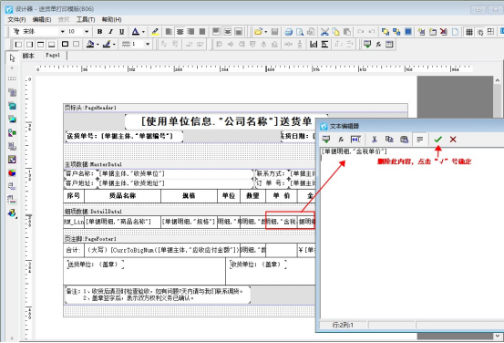 ????在送貨單開單界面,點擊打印按鈕下的“打印格式設計”,選擇此模板,點擊“設計格式”進入模板設計器界面。在模板設計器中,把單價和金額對應的明細數據項文本框雙擊打開,把里面調用的數據項刪除,然后保存模板,如下圖所示:
