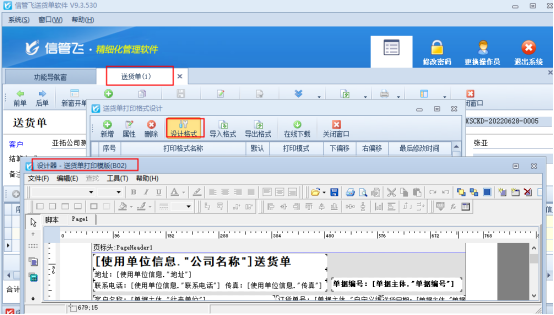 ????以送貨單軟件為例,選擇一個送貨單單據,選擇“打印”—》“打印格式設計”—》“設計格式”進入打印模板設計器頁面,如下圖1、圖2所示: