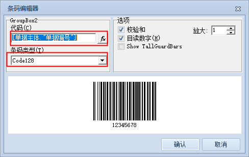????需要單據編號以條形碼形式顯示,在打印模板設計器界面先刪除原文本框。點擊左側工具欄最下邊圖標,下拉列表點擊“Barcode”添加放置到原單據編號位置,放置完成雙擊打開進行配置調用參數和條碼類型,如下圖所示: