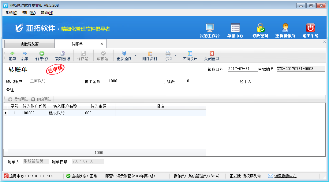????在單據主體內輸入“轉出賬戶”以及“轉出金額”,在單據明細內輸入“轉入賬戶”以及相應的“轉入金額”,然后保存并審核單據即可,其中需要注意的是:“轉入金額”加上“手續費”需等于“轉出金額”。