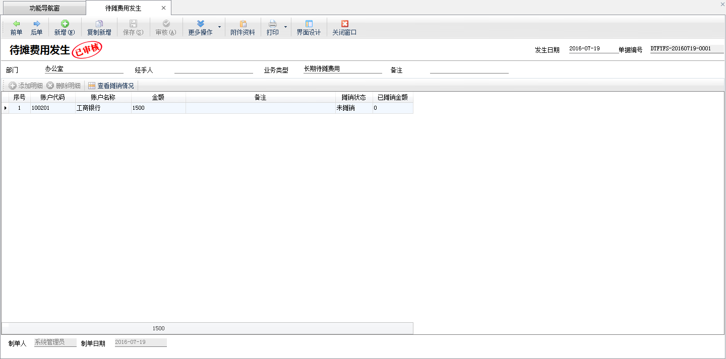 ????點擊“財務處理”—》“待攤費用”—》“待攤費用發生”,在“待攤費用發生”功能中,錄入付款賬戶和付款金額,如果需要按部門核算也可以選擇相應的部門。