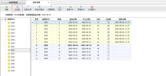 ????反結賬:在工具欄中點擊“反結賬”按鈕,可以對已結賬的賬期進行反結賬。如果當前賬期還沒有執行過期末結賬則會提示無法反結賬。