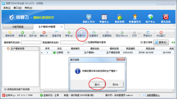 ????在生產(chǎn)模板BOM管理界面,選擇一個已審核的生產(chǎn)模板,在工具欄中點擊“反審”按鈕,系統(tǒng)彈出提示信息“您確定要反審當(dāng)前選擇的生產(chǎn)模板?”,然后點擊“是”按鈕對已審核的生產(chǎn)模板進(jìn)行反審操作,如下圖所示。