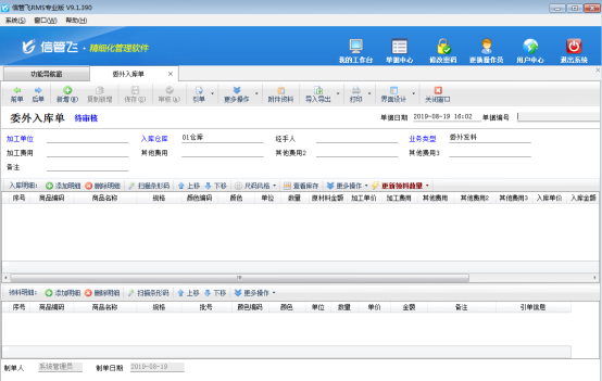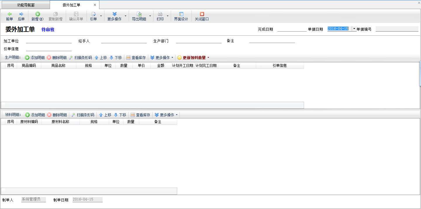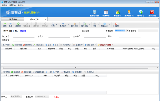 ????(2)當(dāng)需要加工廠進(jìn)行加工時,開“委外加工單”錄入加工任務(wù),軟件會根據(jù)生產(chǎn)模板自動算出需要的原材料明細(xì)。