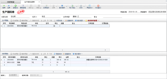 ????生產(chǎn)過程中可通過開“生產(chǎn)領(lǐng)料出庫單”領(lǐng)取原材料出庫。生產(chǎn)領(lǐng)料單包括生產(chǎn)產(chǎn)品明細(xì)和領(lǐng)料明細(xì)兩部分,支持根據(jù)“生產(chǎn)模板”自動生成需要的原材料明細(xì)。生產(chǎn)明細(xì)中的商品并不影響倉庫庫存,領(lǐng)料明細(xì)中的原材料將會出庫。
